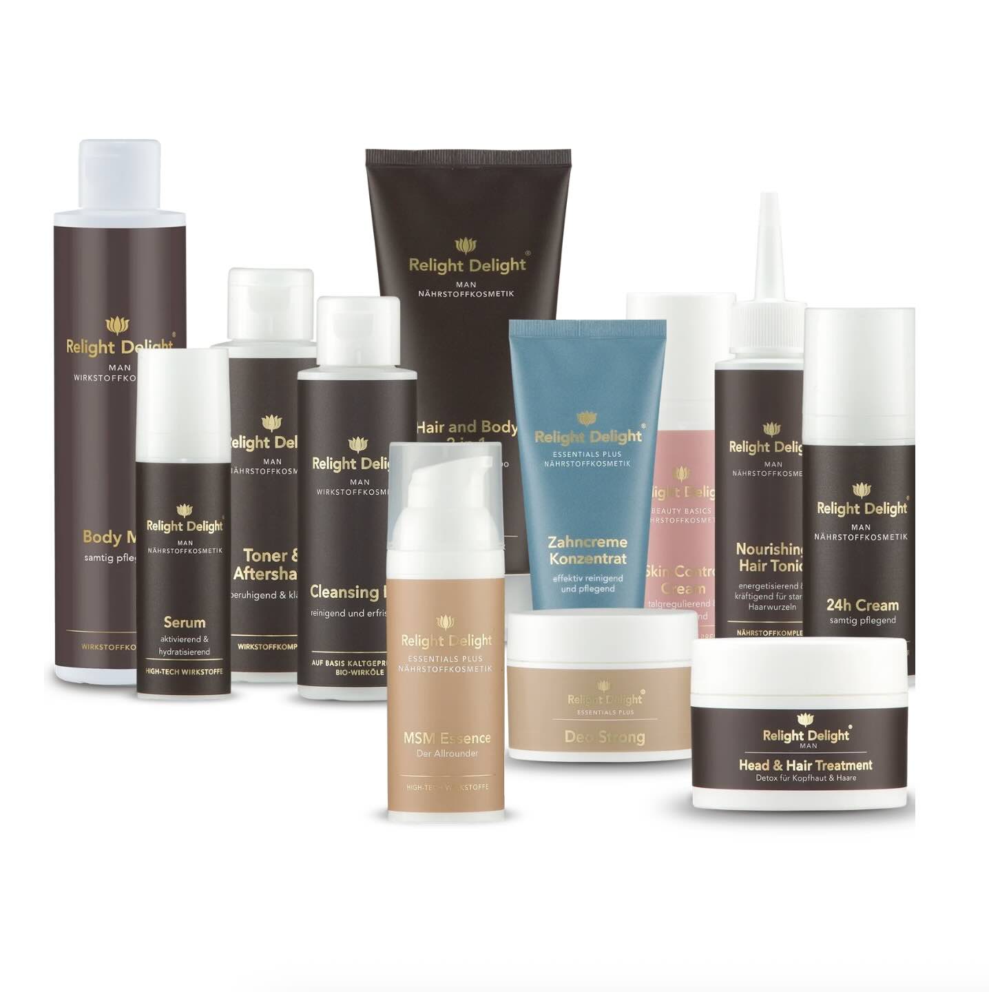 Das Multitalent, die Relight Delight MSM-Essenz, darf natürlich im Pflege-Set für Männer – unwiderstehlich männlich nicht fehlen. Der in ihr enthaltene Schwefel gehört zu den lebensnotwendigen und wichtigsten Stoffen für den menschlichen Körper und seine Stoffwechselprozesse. Die kühlende MSM-Essenz kann Rötungen und unangenehme Hautbeschwerden aller Art lindern. Trage die MSM-Essenz 1-2-mal täglich auf die gereinigte Haut VOR dem Pflegeserum und der Pflegecreme auf.